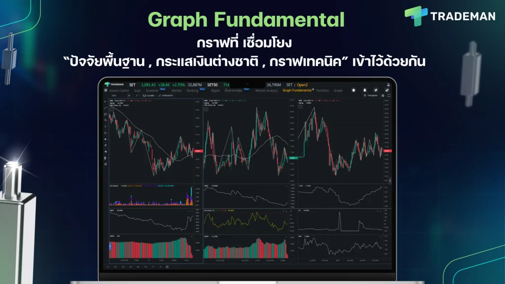ไม่ใช่แค่กราฟเทคนิคธรรมดา แต่เป็นกราฟที่ออกแบบมาให้ “เชื่อมโยง ปัจจัยพื้นฐาน , กระแสเงินต่างชาติ , กราฟเทคนิค” เข้าไว้ด้วยกัน — ตั้งแต่ปัจจัยพื้นฐานอย่าง EPS, ROE, Margin, ไปจนถึงแรงซื้อขายของนักลงทุนต่างชาติ และสัญญาณเทคนิคแบบคลาสสิก ทั้งหมดนี้อยู่ในกราฟเดียว ช่วยให้คุณอ่านสถานการณ์ของหุ้นได้แบบ 360 องศา ไปพร้อมกันกับ โปรแกรมวิเคราะห์หุ้น Trademan