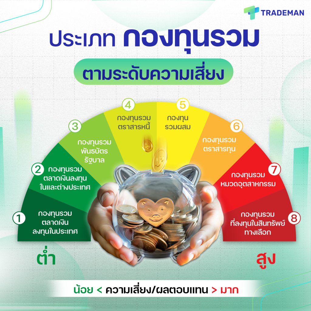 กองทุนมีหลายประเภทให้เลือก ตั้งแต่เสี่ยงต่ำระดับ1 จนถึงเสี่ยงสูงระดับ8 เสี่ยงต่ำ ก็พวกกองทุนรวมตลาดเงินในประเทศและต่างประเทศ กองทุนรัฐบาล พันธบัตรต่างๆ
