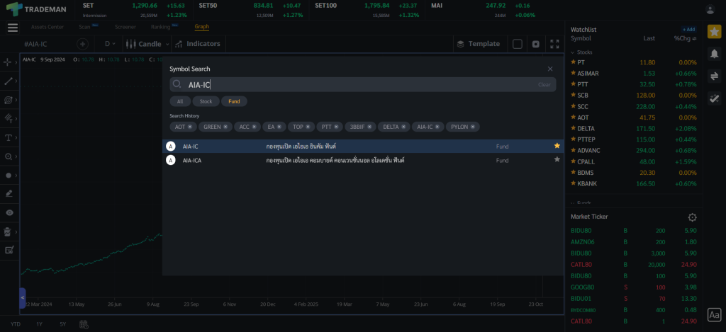 5.พิมพ์ตัวย่อชื่อกองทุนลงในช่องค้นหา ตัวอย่างคือ AIA-IC
