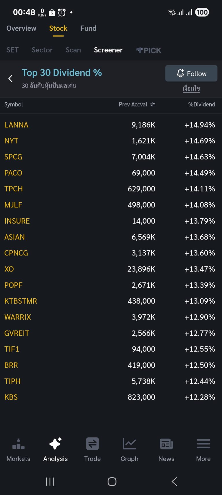 ตัวอย่างผลของฟังก์ชัน Screener เงื่อนไข Top 30 Dividend % ข้อมูล ณ วันที่ 29 ก.ย. 2568 เวลา 00.48 น.