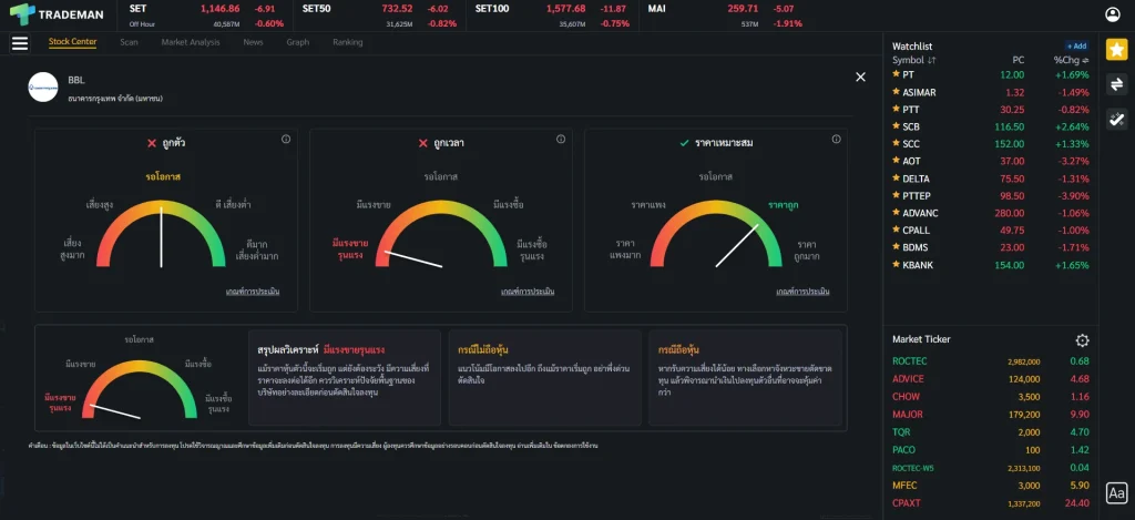 ⚠️ ข้อสังเกต การใช้หน้า Stock Center บน Trademan ทำให้การติดตามหุ้นและวิเคราะห์หุ้นจบในหน้าเดียว ไม่ว่าจะเป็นข้อมูลหุ้น กราฟเทคนิค ข้อมูลธุรกิจ ข่าว ถ้าใช้โปรแกรมอื่นก็ต้องเปิดฟังก์ชันเพิ่มเต็มไปหมด เสียเวลาในการวิเคราะห์มากขึ้นเป็นแน่ มาพร้อมกับฟังก์ชัน Stock Analysis ที่จะช่วยวิเคราะห์หุ้นและแนะนำจุดซื้อถือขาย ประหยัดเวลาเพื่อเรื่องที่สำคัญกว่า