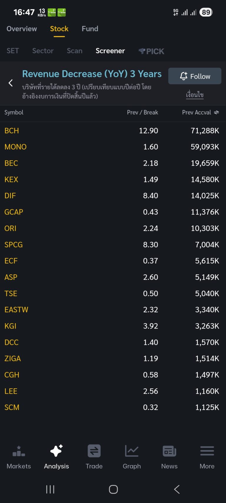 ตัวอย่างผลของฟังก์ชัน Screener เงื่อนไข Revenue Decrease (YoY) 3 Years ข้อมูล ณ วันที่ 18 ก.ย. 2568 เวลา 16.47 น.