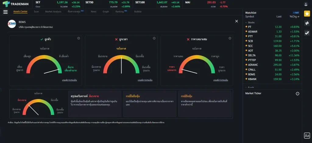⚠️ ข้อสังเกต การใช้หน้า Stock Center บน Trademan ทำให้การติดตามหุ้นและวิเคราะห์หุ้นจบในหน้าเดียว ไม่ว่าจะเป็นข้อมูลหุ้น กราฟเทคนิค ข้อมูลธุรกิจ ข่าว ถ้าใช้โปรแกรมอื่นก็ต้องเปิดฟังก์ชันเพิ่มเต็มไปหมด เสียเวลาในการวิเคราะห์มากขึ้นเป็นแน่ มาพร้อมกับฟังก์ชัน Stock Analysis ที่จะช่วยวิเคราะห์หุ้นและแนะนำจุดซื้อถือขาย ประหยัดเวลาเพื่อเรื่องที่สำคัญกว่า