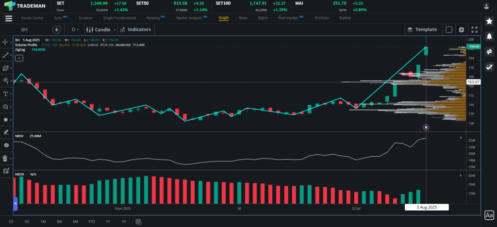 ตัวอย่างกราฟหุ้น BH ข้อมูล ณ วันที่ 5 ส.ค. 2568 เวลา 18.44 น.