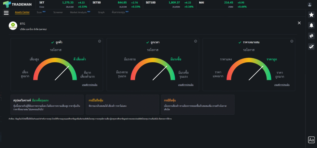⚠️ ข้อสังเกต การใช้หน้า Stock Center บน Trademan ทำให้การติดตามหุ้นและวิเคราะห์หุ้นจบในหน้าเดียว ไม่ว่าจะเป็นข้อมูลหุ้น กราฟเทคนิค ข้อมูลธุรกิจ ข่าว ถ้าใช้โปรแกรมอื่นก็ต้องเปิดฟังก์ชันเพิ่มเต็มไปหมด เสียเวลาในการวิเคราะห์มากขึ้นเป็นแน่ มาพร้อมกับฟังก์ชัน Stock Analysis ที่จะช่วยวิเคราะห์หุ้นและแนะนำจุดซื้อถือขาย ประหยัดเวลาเพื่อเรื่องที่สำคัญกว่า