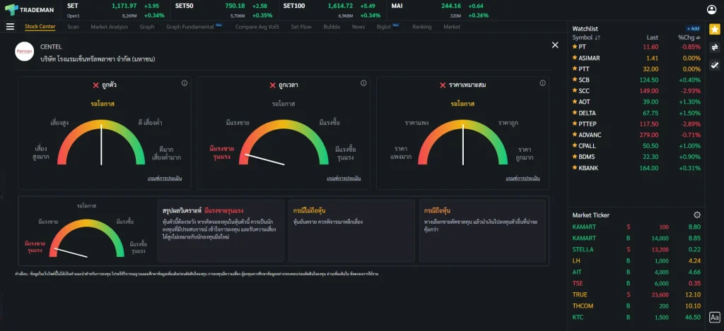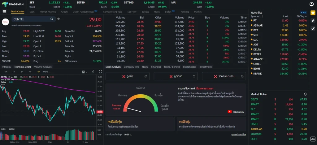 ⚠️ ข้อสังเกต การใช้หน้า Stock Center บน Trademan ทำให้การติดตามหุ้นและวิเคราะห์หุ้นจบในหน้าเดียว ไม่ว่าจะเป็นข้อมูลหุ้น กราฟเทคนิค ข้อมูลธุรกิจ ข่าว ถ้าใช้โปรแกรมอื่นก็ต้องเปิดฟังก์ชันเพิ่มเต็มไปหมด เสียเวลาในการวิเคราะห์มากขึ้นเป็นแน่ มาพร้อมกับฟังก์ชัน Stock Analysis ที่จะช่วยวิเคราะห์หุ้นและแนะนำจุดซื้อถือขาย ประหยัดเวลาเพื่อเรื่องที่สำคัญกว่า