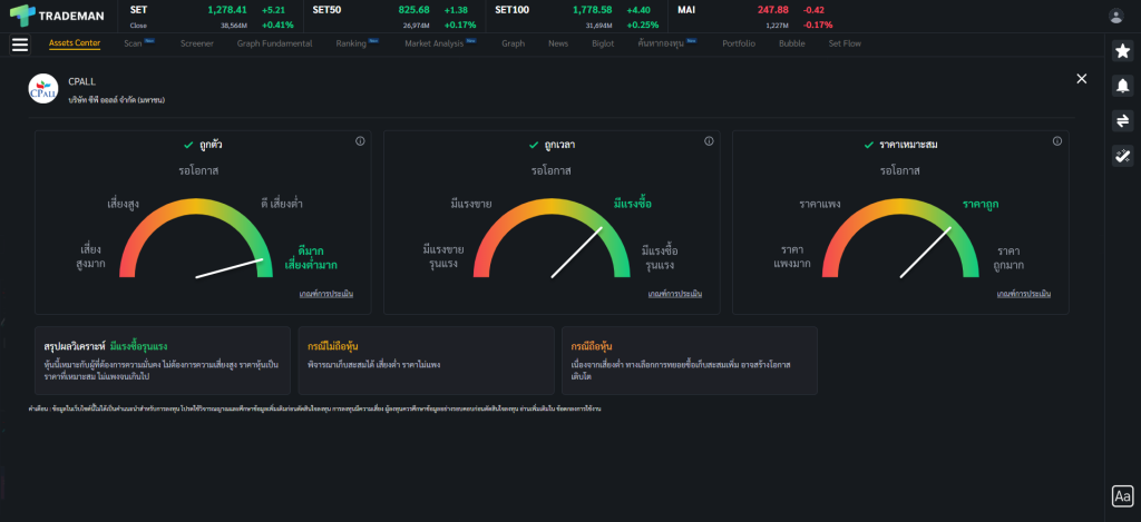 ⚠️ ข้อสังเกต การใช้หน้า Stock Center บน Trademan ทำให้การติดตามหุ้นและวิเคราะห์หุ้นจบในหน้าเดียว ไม่ว่าจะเป็นข้อมูลหุ้น กราฟเทคนิค ข้อมูลธุรกิจ ข่าว ถ้าใช้โปรแกรมอื่นก็ต้องเปิดฟังก์ชันเพิ่มเต็มไปหมด เสียเวลาในการวิเคราะห์มากขึ้นเป็นแน่ มาพร้อมกับฟังก์ชัน Stock Analysis ที่จะช่วยวิเคราะห์หุ้นและแนะนำจุดซื้อถือขาย ประหยัดเวลาเพื่อเรื่องที่สำคัญกว่า