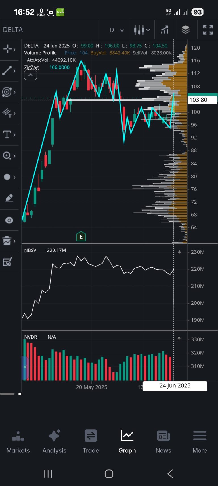 จากการวิเคราะห์ Volume Profile พบว่ามีแนวต้านสำคัญที่ 104.00 บาท ซึ่งเป็นระดับราคาที่นักลงทุนควรจับตามองอย่างใกล้ชิด หากราคาไม่สามารถยืนเหนือแนวต้านนี้ไปได้ อาจมีโอกาสปรับตัวลง