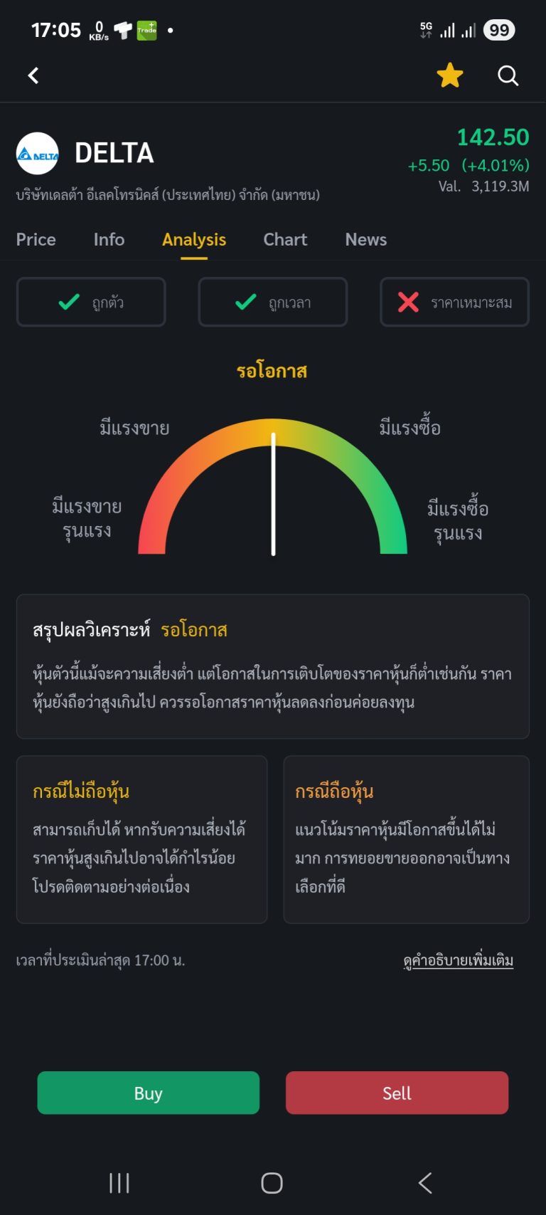 ตัวอย่างผลการวิเคราะห์หุ้น DELTA จาก Stock Analysis ข้อมูล ณ วันที่ 23 ก.ค. 2568 เวลา 17.05 น.