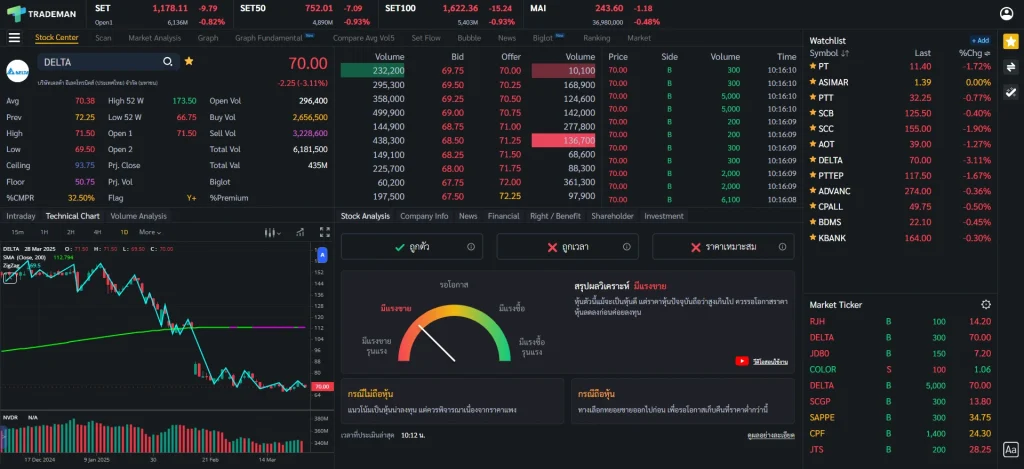 ⚠️ ข้อสังเกต การใช้หน้า Stock Center บน Trademan ทำให้การติดตามหุ้นและวิเคราะห์หุ้นจบในหน้าเดียว ไม่ว่าจะเป็นข้อมูลหุ้น กราฟเทคนิค ข้อมูลธุรกิจ ข่าว ถ้าใช้โปรแกรมอื่นก็ต้องเปิดฟังก์ชันเพิ่มเต็มไปหมด เสียเวลาในการวิเคราะห์มากขึ้นเป็นแน่ มาพร้อมกับฟังก์ชัน Stock Analysis ที่จะช่วยวิเคราะห์หุ้นและแนะนำจุดซื้อถือขาย ประหยัดเวลาเพื่อเรื่องที่สำคัญกว่า
