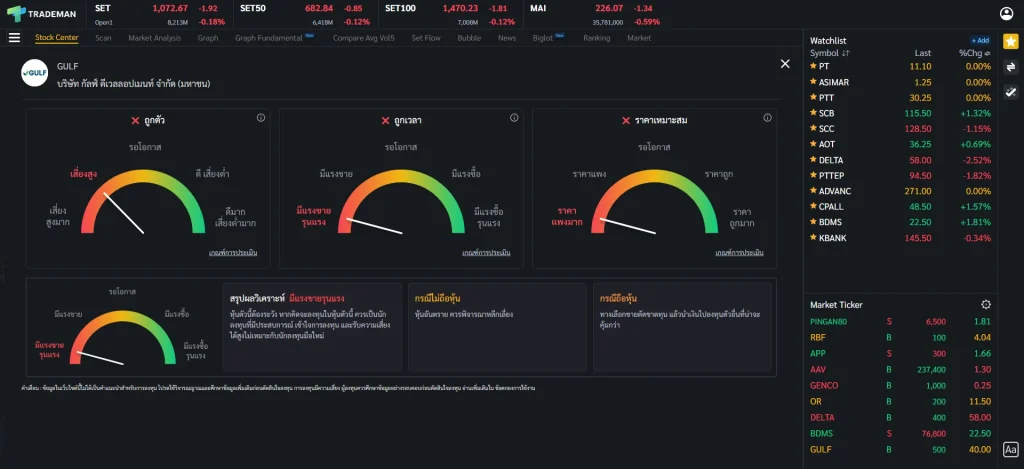 ⚠️ ข้อสังเกต การใช้หน้า Stock Center บน Trademan ทำให้การติดตามหุ้นและวิเคราะห์หุ้นจบในหน้าเดียว ไม่ว่าจะเป็นข้อมูลหุ้น กราฟเทคนิค ข้อมูลธุรกิจ ข่าว ถ้าใช้โปรแกรมอื่นก็ต้องเปิดฟังก์ชันเพิ่มเต็มไปหมด เสียเวลาในการวิเคราะห์มากขึ้นเป็นแน่ มาพร้อมกับฟังก์ชัน Stock Analysis ที่จะช่วยวิเคราะห์หุ้นและแนะนำจุดซื้อถือขาย ประหยัดเวลาเพื่อเรื่องที่สำคัญกว่า