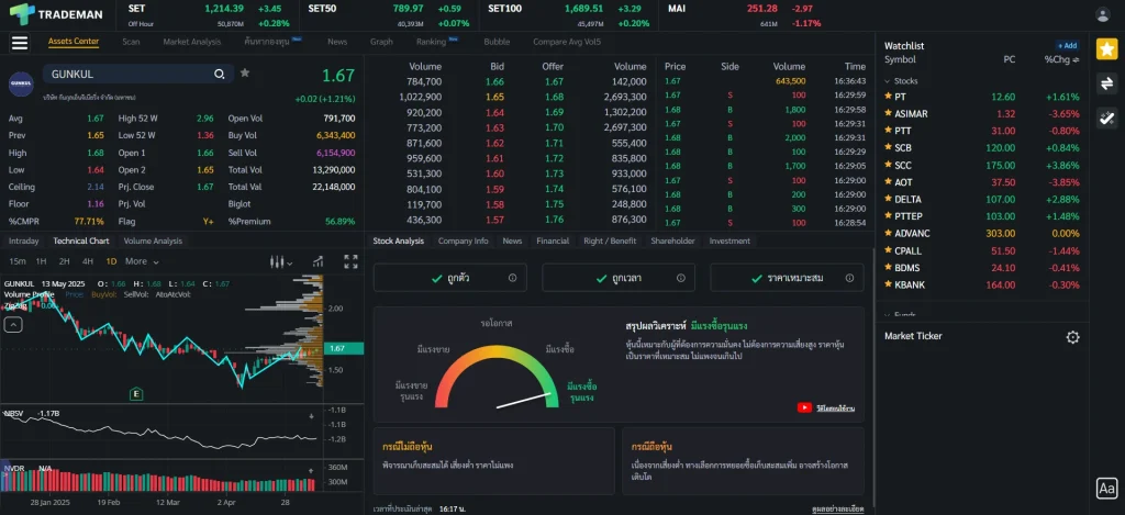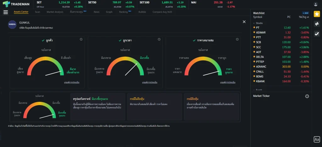 ⚠️ ข้อสังเกต การใช้หน้า Stock Center บน Trademan ทำให้การติดตามหุ้นและวิเคราะห์หุ้นจบในหน้าเดียว ไม่ว่าจะเป็นข้อมูลหุ้น กราฟเทคนิค ข้อมูลธุรกิจ ข่าว ถ้าใช้โปรแกรมอื่นก็ต้องเปิดฟังก์ชันเพิ่มเต็มไปหมด เสียเวลาในการวิเคราะห์มากขึ้นเป็นแน่ มาพร้อมกับฟังก์ชัน Stock Analysis ที่จะช่วยวิเคราะห์หุ้นและแนะนำจุดซื้อถือขาย ประหยัดเวลาเพื่อเรื่องที่สำคัญกว่า