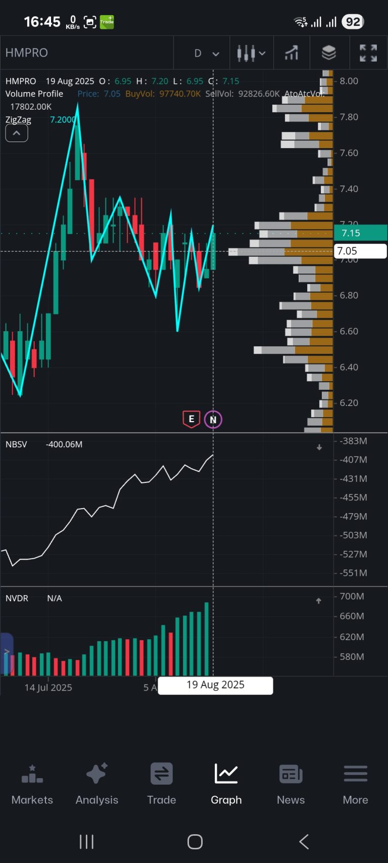 จากการวิเคราะห์ Volume Profile พบว่ามีแนวรับสำคัญที่ 7.05 บาท ซึ่งเป็นระดับราคาที่นักลงทุนควรจับตามองอย่างใกล้ชิด หากราคาไม่สามารถยืนเหนือแนวต้านนี้ไปได้ อาจมีโอกาสปรับตัวลง