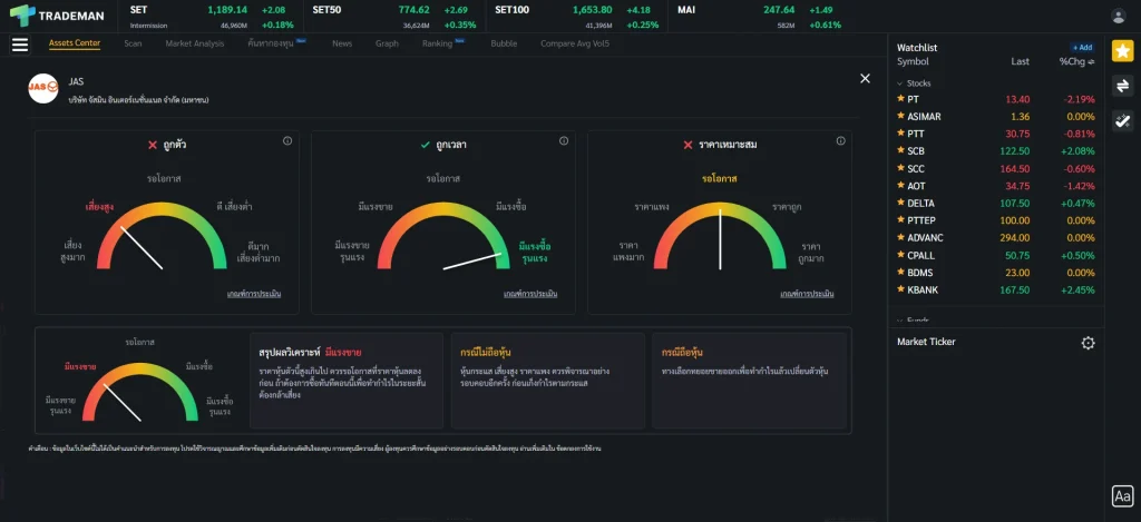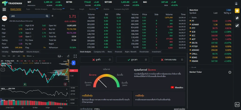 ⚠️ ข้อสังเกต การใช้หน้า Stock Center บน Trademan ทำให้การติดตามหุ้นและวิเคราะห์หุ้นจบในหน้าเดียว ไม่ว่าจะเป็นข้อมูลหุ้น กราฟเทคนิค ข้อมูลธุรกิจ ข่าว ถ้าใช้โปรแกรมอื่นก็ต้องเปิดฟังก์ชันเพิ่มเต็มไปหมด เสียเวลาในการวิเคราะห์มากขึ้นเป็นแน่ มาพร้อมกับฟังก์ชัน Stock Analysis ที่จะช่วยวิเคราะห์หุ้นและแนะนำจุดซื้อถือขาย ประหยัดเวลาเพื่อเรื่องที่สำคัญกว่า