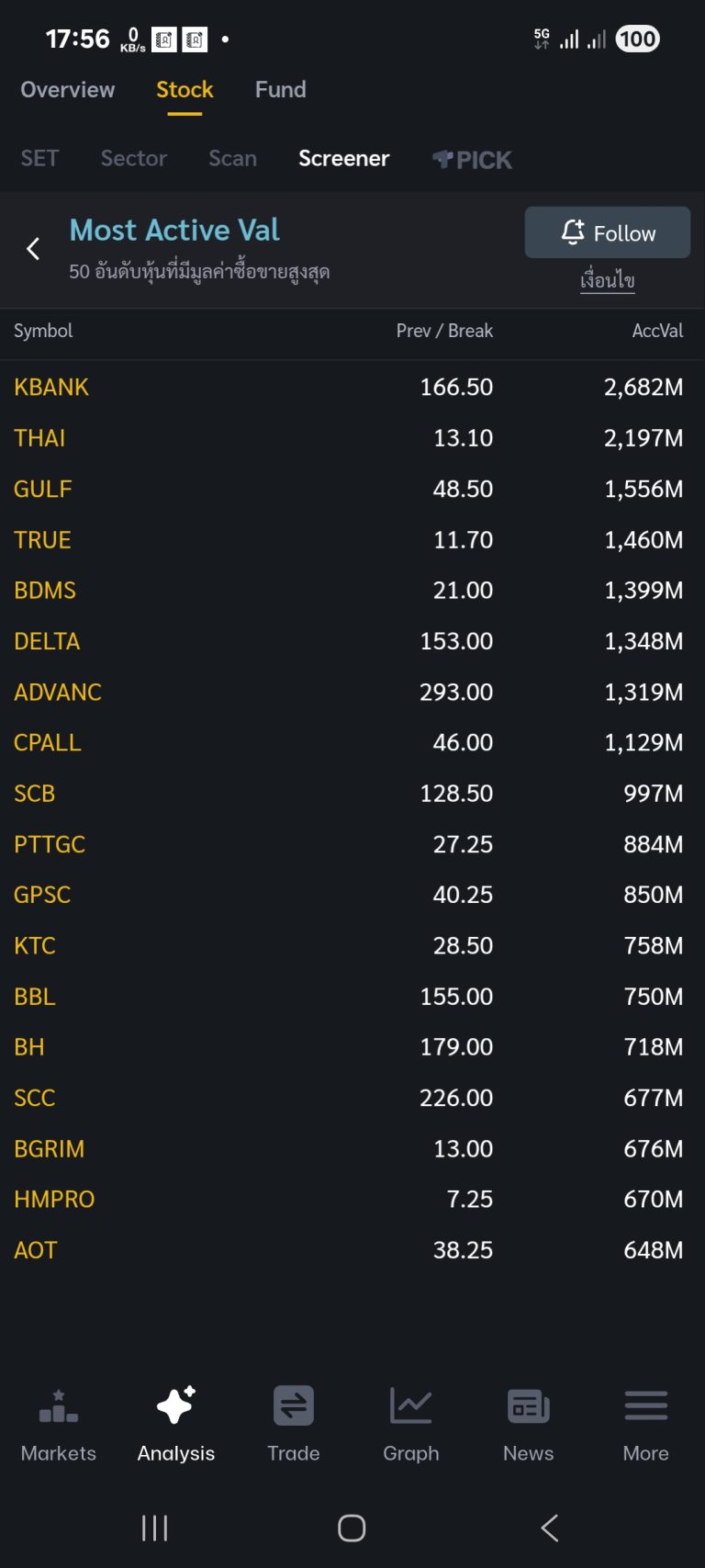 ตัวอย่างผลของฟังก์ชัน Screener เงื่อนไข Most Active Val ข้อมูล ณ วันที่ 28 ส.ค. 2568 เวลา 17.56 น.