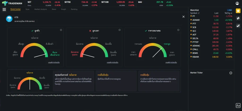 ⚠️ ข้อสังเกต การใช้หน้า Stock Center บน Trademan ทำให้การติดตามหุ้นและวิเคราะห์หุ้นจบในหน้าเดียว ไม่ว่าจะเป็นข้อมูลหุ้น กราฟเทคนิค ข้อมูลธุรกิจ ข่าว ถ้าใช้โปรแกรมอื่นก็ต้องเปิดฟังก์ชันเพิ่มเต็มไปหมด เสียเวลาในการวิเคราะห์มากขึ้นเป็นแน่ มาพร้อมกับฟังก์ชัน Stock Analysis ที่จะช่วยวิเคราะห์หุ้นและแนะนำจุดซื้อถือขาย ประหยัดเวลาเพื่อเรื่องที่สำคัญกว่า