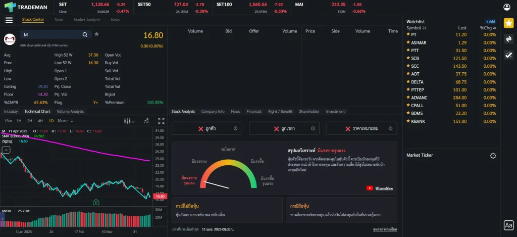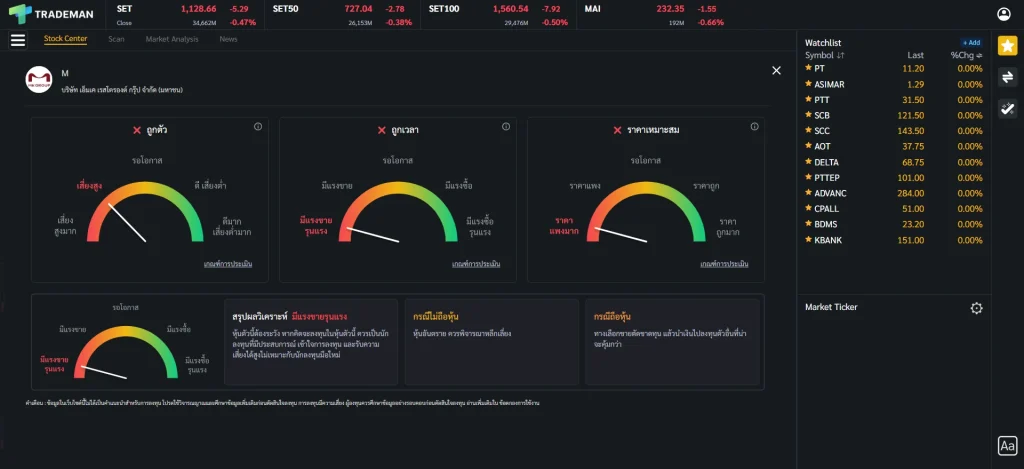 ⚠️ ข้อสังเกต การใช้หน้า Stock Center บน Trademan ทำให้การติดตามหุ้นและวิเคราะห์หุ้นจบในหน้าเดียว ไม่ว่าจะเป็นข้อมูลหุ้น กราฟเทคนิค ข้อมูลธุรกิจ ข่าว ถ้าใช้โปรแกรมอื่นก็ต้องเปิดฟังก์ชันเพิ่มเต็มไปหมด เสียเวลาในการวิเคราะห์มากขึ้นเป็นแน่ มาพร้อมกับฟังก์ชัน Stock Analysis ที่จะช่วยวิเคราะห์หุ้นและแนะนำจุดซื้อถือขาย ประหยัดเวลาเพื่อเรื่องที่สำคัญกว่า