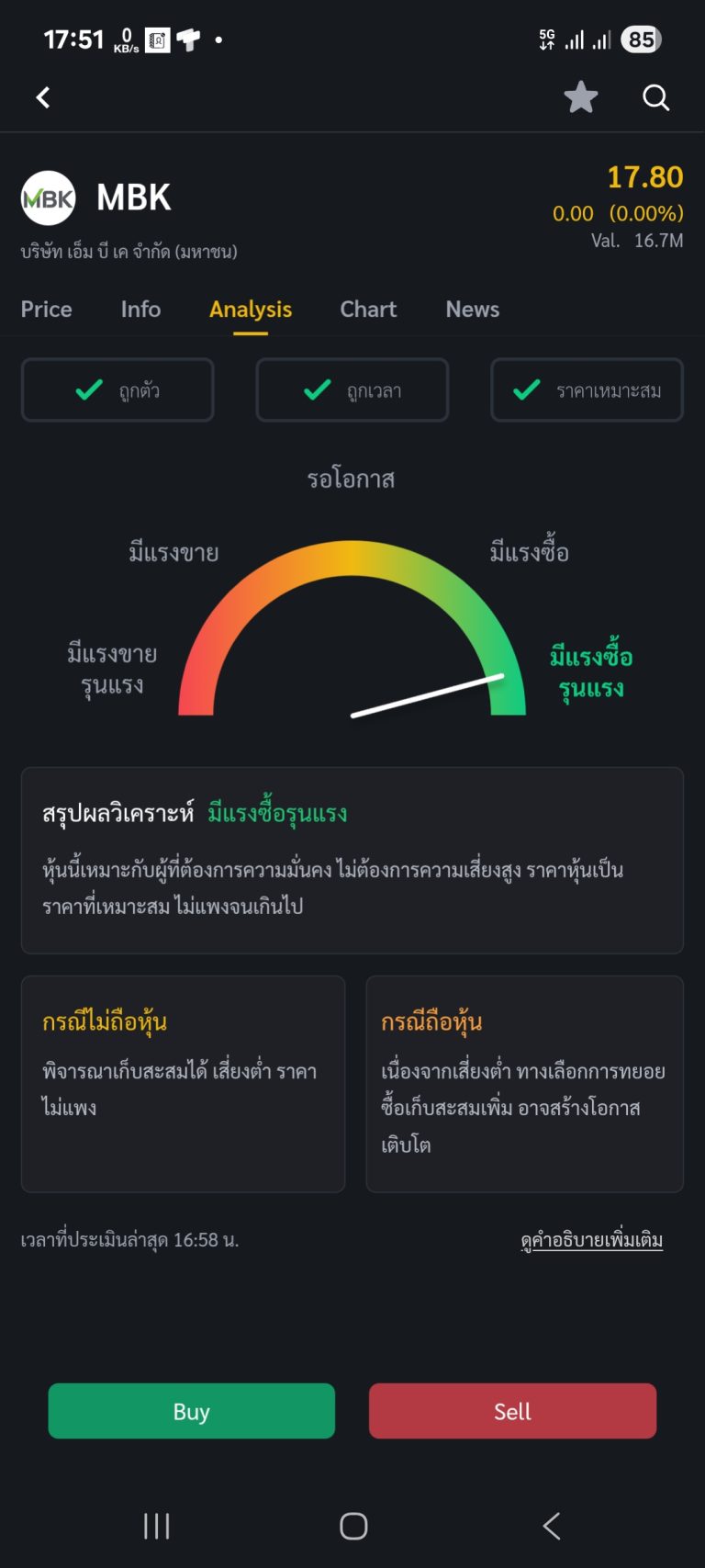 ตัวอย่างผลการวิเคราะห์หุ้น MBK จาก Stock Analysis ข้อมูล ณ วันที่ 25 ส.ค. 2568 เวลา 17.51 น.