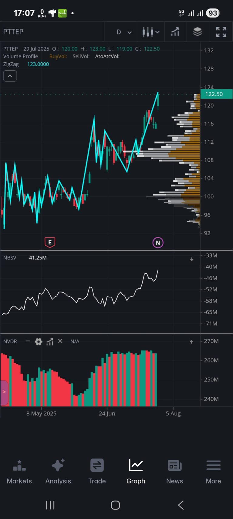 จากการวิเคราะห์ Volume Profile พบว่ามีแนวรับสำคัญที่ 110.00 บาท ซึ่งเป็นระดับราคาที่นักลงทุนควรจับตามองอย่างใกล้ชิด หากราคาไม่สามารถยืนเหนือแนวต้านนี้ไปได้ อาจมีโอกาสปรับตัวลง
