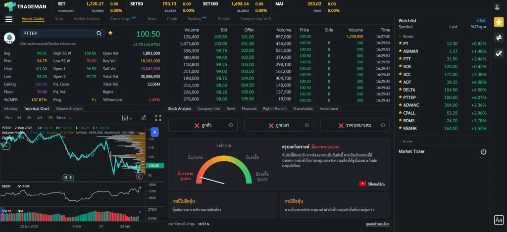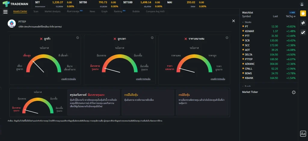 ⚠️ ข้อสังเกต การใช้หน้า Stock Center บน Trademan ทำให้การติดตามหุ้นและวิเคราะห์หุ้นจบในหน้าเดียว ไม่ว่าจะเป็นข้อมูลหุ้น กราฟเทคนิค ข้อมูลธุรกิจ ข่าว ถ้าใช้โปรแกรมอื่นก็ต้องเปิดฟังก์ชันเพิ่มเต็มไปหมด เสียเวลาในการวิเคราะห์มากขึ้นเป็นแน่ มาพร้อมกับฟังก์ชัน Stock Analysis ที่จะช่วยวิเคราะห์หุ้นและแนะนำจุดซื้อถือขาย ประหยัดเวลาเพื่อเรื่องที่สำคัญกว่า