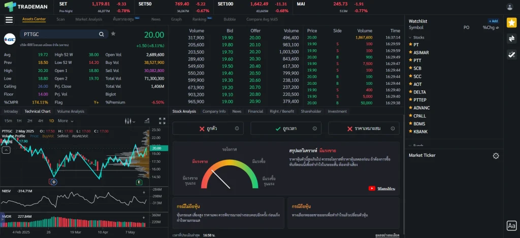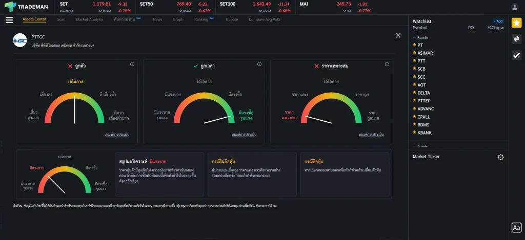 ⚠️ ข้อสังเกต การใช้หน้า Stock Center บน Trademan ทำให้การติดตามหุ้นและวิเคราะห์หุ้นจบในหน้าเดียว ไม่ว่าจะเป็นข้อมูลหุ้น กราฟเทคนิค ข้อมูลธุรกิจ ข่าว ถ้าใช้โปรแกรมอื่นก็ต้องเปิดฟังก์ชันเพิ่มเต็มไปหมด เสียเวลาในการวิเคราะห์มากขึ้นเป็นแน่ มาพร้อมกับฟังก์ชัน Stock Analysis ที่จะช่วยวิเคราะห์หุ้นและแนะนำจุดซื้อถือขาย ประหยัดเวลาเพื่อเรื่องที่สำคัญกว่า