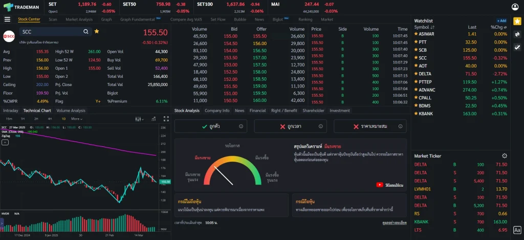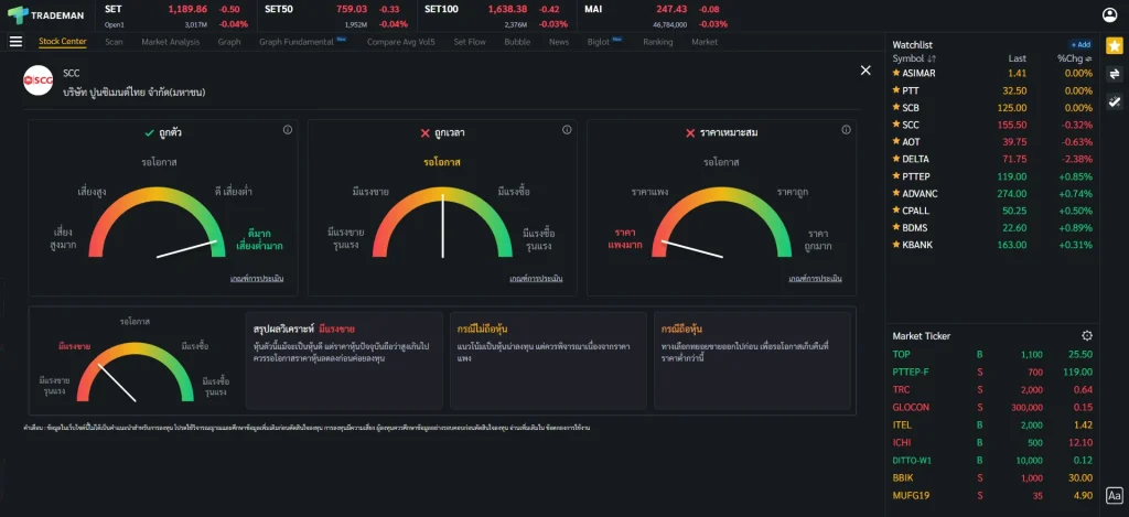 ⚠️ ข้อสังเกต การใช้หน้า Stock Center บน Trademan ทำให้การติดตามหุ้นและวิเคราะห์หุ้นจบในหน้าเดียว ไม่ว่าจะเป็นข้อมูลหุ้น กราฟเทคนิค ข้อมูลธุรกิจ ข่าว ถ้าใช้โปรแกรมอื่นก็ต้องเปิดฟังก์ชันเพิ่มเต็มไปหมด เสียเวลาในการวิเคราะห์มากขึ้นเป็นแน่ มาพร้อมกับฟังก์ชัน Stock Analysis ที่จะช่วยวิเคราะห์หุ้นและแนะนำจุดซื้อถือขาย ประหยัดเวลาเพื่อเรื่องที่สำคัญกว่า