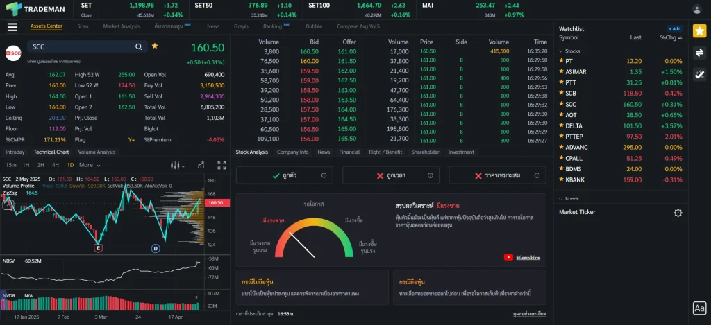 ⚠️ ข้อสังเกต การใช้หน้า Stock Center บน Trademan ทำให้การติดตามหุ้นและวิเคราะห์หุ้นจบในหน้าเดียว ไม่ว่าจะเป็นข้อมูลหุ้น กราฟเทคนิค ข้อมูลธุรกิจ ข่าว ถ้าใช้โปรแกรมอื่นก็ต้องเปิดฟังก์ชันเพิ่มเต็มไปหมด เสียเวลาในการวิเคราะห์มากขึ้นเป็นแน่ มาพร้อมกับฟังก์ชัน Stock Analysis ที่จะช่วยวิเคราะห์หุ้นและแนะนำจุดซื้อถือขาย ประหยัดเวลาเพื่อเรื่องที่สำคัญกว่า