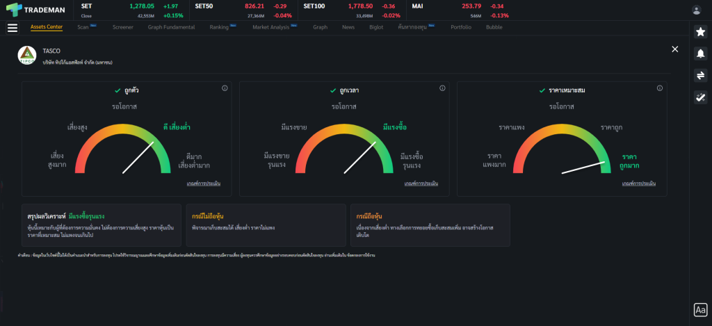 ⚠️ ข้อสังเกต การใช้หน้า Stock Center บน Trademan ทำให้การติดตามหุ้นและวิเคราะห์หุ้นจบในหน้าเดียว ไม่ว่าจะเป็นข้อมูลหุ้น กราฟเทคนิค ข้อมูลธุรกิจ ข่าว ถ้าใช้โปรแกรมอื่นก็ต้องเปิดฟังก์ชันเพิ่มเต็มไปหมด เสียเวลาในการวิเคราะห์มากขึ้นเป็นแน่ มาพร้อมกับฟังก์ชัน Stock Analysis ที่จะช่วยวิเคราะห์หุ้นและแนะนำจุดซื้อถือขาย ประหยัดเวลาเพื่อเรื่องที่สำคัญกว่า