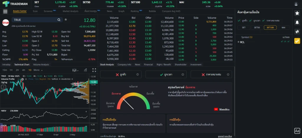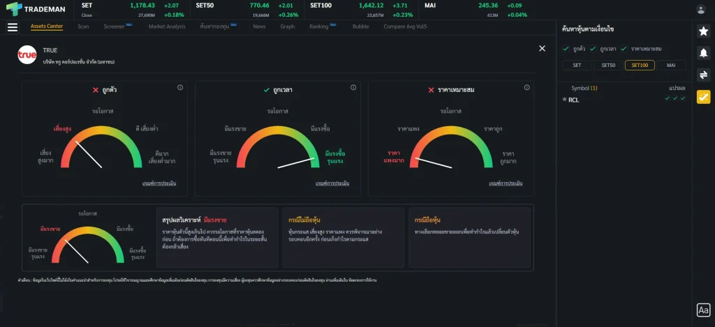 ⚠️ ข้อสังเกต การใช้หน้า Stock Center บน Trademan ทำให้การติดตามหุ้นและวิเคราะห์หุ้นจบในหน้าเดียว ไม่ว่าจะเป็นข้อมูลหุ้น กราฟเทคนิค ข้อมูลธุรกิจ ข่าว ถ้าใช้โปรแกรมอื่นก็ต้องเปิดฟังก์ชันเพิ่มเต็มไปหมด เสียเวลาในการวิเคราะห์มากขึ้นเป็นแน่ มาพร้อมกับฟังก์ชัน Stock Analysis ที่จะช่วยวิเคราะห์หุ้นและแนะนำจุดซื้อถือขาย ประหยัดเวลาเพื่อเรื่องที่สำคัญกว่า