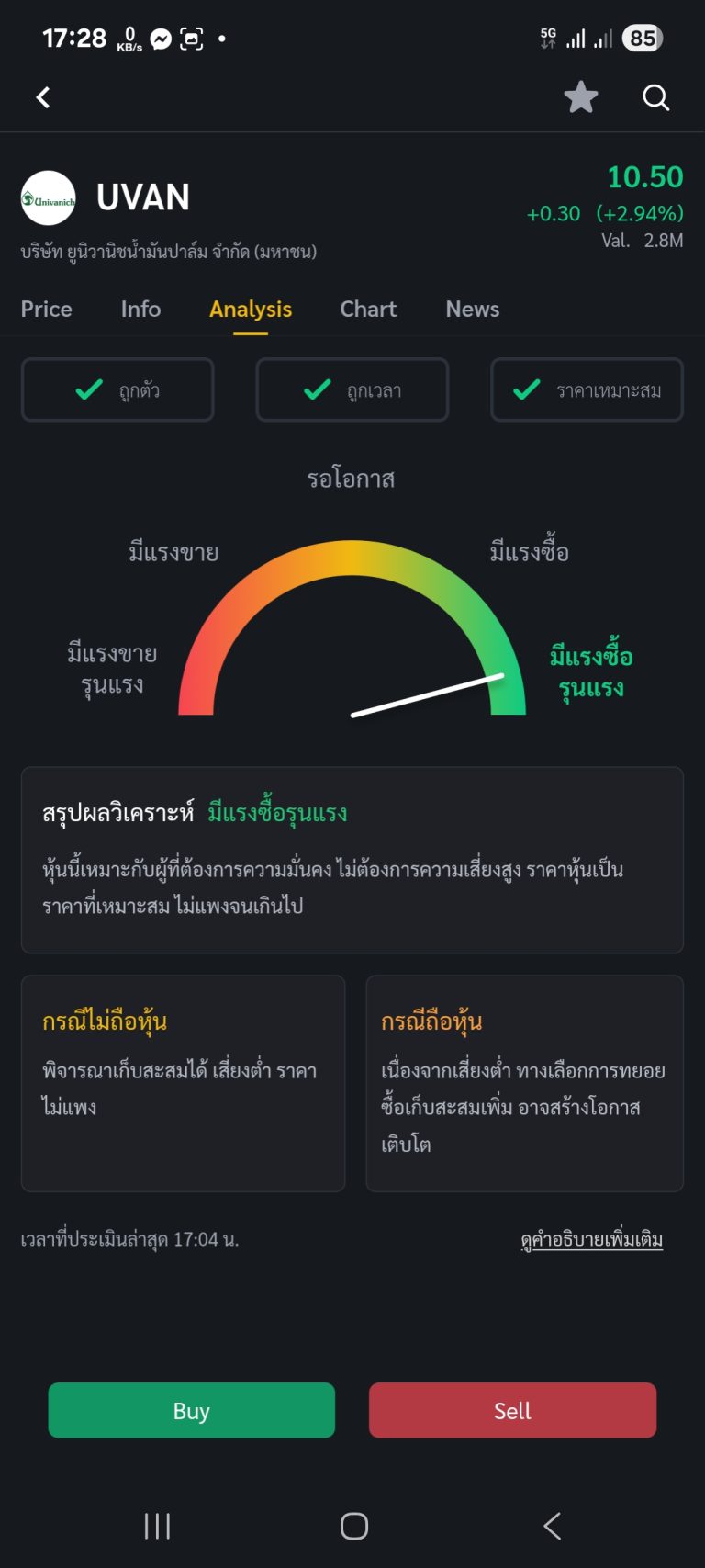 ตัวอย่างผลการวิเคราะห์หุ้น UVAN จาก Stock Analysis ข้อมูล ณ วันที่ 1 ก.ย. 2568 เวลา 17.28 น.
