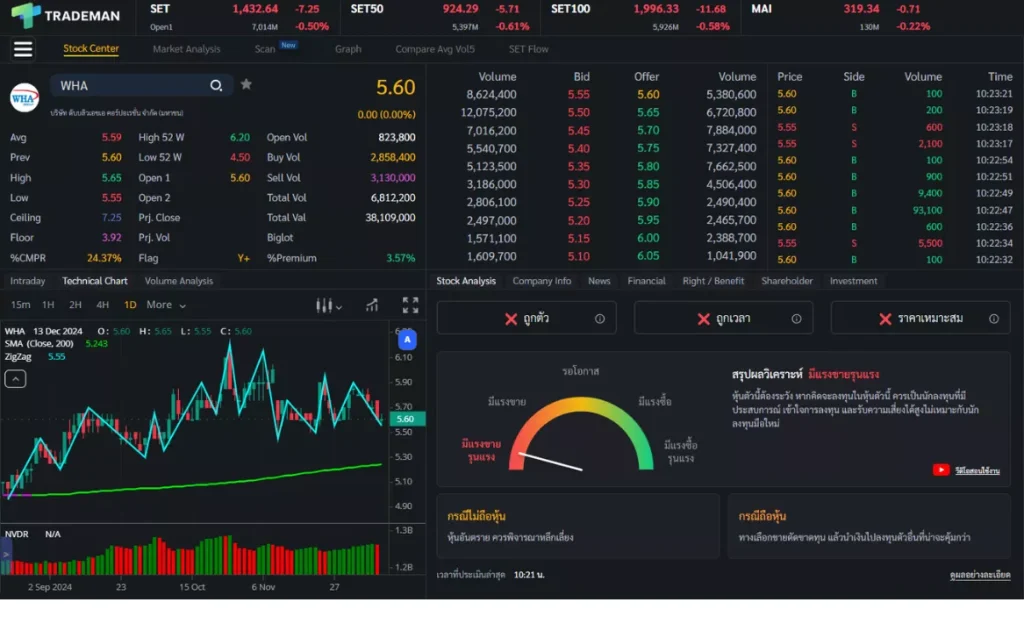 เมื่อสนใจหุ้นตัวใด สามารถคลิกเข้าไปดูรายละเอียดเพิ่มเติม เช่น กรณีของ WHA พบว่า ผิดตัว ผิดเวลา และราคาไม่เหมาะสม แสดงว่า WHA สามารถทำกำไรขาลง(Short) ได้